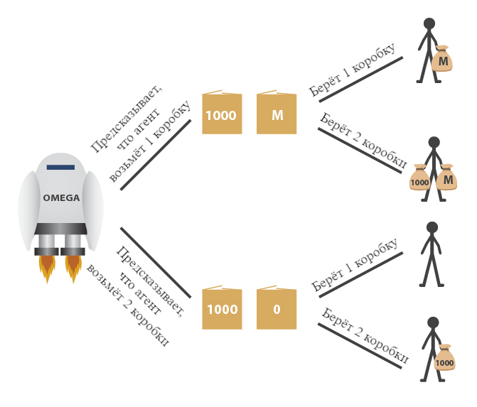 Но предположим, что есть другой суперинтеллектуальный робот, Мета-Омега, который, как известно, умеет идеально предсказывать как действия людей, так и действия Омеги. Мета-Омега говорит вам, что либо вы возьмёте две коробки, а Омега «сделает свой ход» после вашего выбора, либо вы возьмёте одну коробку, но Омега уже сделал свой ход (и улетел играть с кем-то ещё).
